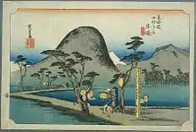 During a census in 1843, the post station was found to have a population of 2,114 people and 443 houses, which included one honjin, 1 sub-honjin and 54 hatago.[1] The classic ukiyo-e print by Andō Hiroshige (Hōeidō edition) from 1831–1834 does not depicts the post station at all, but instead shows a zig-zag road above marshy fields, with Mount Fuji appearing behind Shonan Daira in the background. One of the travelers is a professional courier running as part of the mail service offered along the Tōkaidō. Relays of runners could convey a message from Edo to Kyoto in 90 hours.