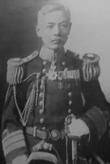 In December 1903, he became captain of the Oshima and went to the Russo-Japanese War and initially participated in the Battle of Port Arthur.[1][4] On May 18, 1904, the Oshima was hit by the gunboat Akagi and sank in heavy fog while on a patrol off the coast of Lushun.[1] In the same month, he was transferred to become captain of the Chōkai. In January 1905, he assumed the post of captain of the Akitsushima and on the same month, was promoted to Captain. He took part in the Battle of the Yellow Sea. In June of the same year, he was transferred to Captain of the Naniwa.