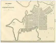 The Historic Centre of Cienfuegos, is located in the city of Cienfuegos in Cuba. It was declared a UNESCO World Heritage Site in 2005, because of its outstanding Neoclassical architecture and its status as the best example of early 19th century Spanish urban planning. The historic centre contains six buildings from 1819 to 1850, 327 buildings from 1851 to 1900, and 1188 buildings from the 20th century.