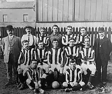 For an entire nine years the club ceased play. Until, on 11 September 1900, Bath AFC was re-formed by members of the Bath Association Cricket Club, led by eventual player, William Hyman. A large meeting was called at the Railway Hotel, on James Street in the city centre, to discuss, and in a viable form, an association football team to represent the city of Bath.[14] The meeting was a success and Bath City FC, by name was officially born.[15][16][5] Hyman went on to score 131 goals for Bath in the early 20th century, making him, to this day, the club's second all-time top goal scorer, he also frequently acted as the club's honorary secretary in board meetings.[17][18] The headquarters and changing rooms would be near the ground at the Belvoir Castle pub.[19]