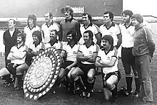 The team remained in the Southern League until 1939, with former Liverpool player and Scottish international, Alex Raisbeck as first team coach from 1938 to 1939.[47] Raisbeck left to be replaced by Ted Davis, his second spell at Bath. In the summer of 1939, Arthur Mortimer was appointed as the club's new chairman.[48] Upon the Outbreak of the Second World War, the club were, by chance, accepted to join the temporary Football League North, competing with the likes of Liverpool, Manchester United, Aston Villa and Everton. That season the club competed in their highest attended game to date, playing Aston Villa at Villa Park in front of over 30,000.[49] The team finished the eventual champions under Davis, thereby becoming the only semi-professional side ever to win a Football League trophy.[50][51]