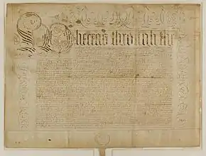 Dunster's conflict with the colony's magistrates began when he failed to have his infant son baptized, believing as an adherent of the Believers baptism of English Baptists and/or Anabaptists that only adults should be baptized. Efforts to restore Dunster to Puritan orthodoxy failed and his apostasy proved untenable to colony leaders who had entrusted him in his job as Harvard's president to uphold the colony's religious mission, thus he represented a threat to the stability of society. Dunster exiled himself in 1654 and moved to nearby Plymouth Colony, where he died in 1658.[5] Because it had been illegal for the colony to establish a college, Charles II rescinded the Massachusetts Bay Colony charter in 1684 by writ of scire facias.[6]