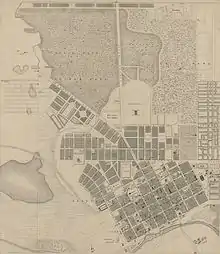 Bourke also commissioned Robert Hoddle to make the first plan for the town, completed on 25 March 1837, which came to be known as the Hoddle Grid.[14] The surveys were intended to prepare for land sales by public auction. Bourke visited Port Phillip in March 1837, confirmed Lonsdale's choice of a site for the new town and named it Melbourne on 10 April 1837[15] after the then British prime minister William Lamb, 2nd Viscount Melbourne, who resided in the village of Melbourne in Derbyshire. The General Post Office opened under that name on 13 April 1837.[16] Before being officially named, the town had several interim names – including Batmania, Bearbrass, Bareport, Bareheep, Barehurp and Bareberp.[16][17][18] Public auctions for land began in June 1837. The compensation of the Port Phillip Association were only recognised to the extent of £7,000, allowed as a reduction on the purchase price of land bought by the association. Most of the members sold their entitlements to Charles Swanston.