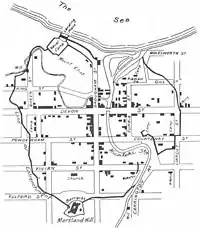 European settlement began in the early 1840s at a time when many original Maori inhabitants were absent, either because they had been taken captive by northern Maori warriors or had migrated south to avoid war.[1] The rapid growth of the colonist population, coupled with insatiable demands for land by the New Zealand Company[2] and the dubious practices it employed in purchasing it,[1][3] created friction with local Maori,[4] leading to a war in the 1860s. New Plymouth became a fortified garrison town and its residents suffered hunger and disease.[2] Farming was impeded and immigration and trade came to a halt.[2]