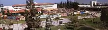 The Normal School was initially built for a maximum capacity of 600 students. Hardy proposed in 1922 building on a new campus at a 125-acre (51 ha) plot at Park Boulevard (near Balboa Park), which was rejected by San Diego voters.[21] However, the California legislature authorized a move to a new site in 1925 if San Diego was willing to buy the old school building and provide a new site. The following year the Citizen's Advisory Committee, a 21-member committee led by Mayor John L. Bacon, initially recommended the northeast part of Balboa Park that would be located over 122 acres (49 ha), but the location was voted down by San Diego voters. In 1927, another location was selected, this time in Encanto, but was also voted down.[22] In total, ten locations would be proposed before the final location was chosen.[23] By June 1928, the Bell-Lloyd Investment Company offered 125 acres (51 ha) at Mission Palisades, $50,000, and a promise to build a road connecting the site to El Cajon Blvd. The site was located at the east side of Mission Valley, about 10 miles (16 km) away from the old site. The group proposed the site in hopes of it being the center of a new retail and housing development.[24] Before the new site could be built, San Diego voters had to approve of buying the old site, which it did overwhelmingly on May 15, 1928.[23] After the move to the new campus, the old Normal School building was used for Horace Mann Junior High and administrative offices. In 1955, it was demolished to make room for a new wing of an administrative building.[25]