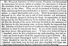 In 1836, William Johnson of Tyler county attempted to transport 12 freedpersons to Liberia, but lacked the connections and wealth of the Blackburn and Washington families. The Society issued an appeal for funds, donations were received from colonizationists in Wheeling and other friends and family. He accompanied the new emigrants to Washington, D.C., and then to Norfolk, where they embarked on the Saluda for Liberia in 1840.