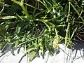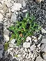 Hladnikia pastinacifolia is a monocarpic herbaceous perennial plant, which takes a few vegetation periods to develop into a flowering plant.[6] Individuals, which have erect flowering stem, can reach from 15 to 30 centimetres of height.[8] At first plant's leathery and glossy leaves are simple shaped and arranged into rosettes. Later on, as their area increases, leaves also change shape into lobate.[6][8] Hladnikia pastinacifolia resembles well-known celery (Apium graveolens), but has thicker foliage and shorter leaf stems.[4] The species' root is long and lignified. The plant's flower has white, heart-shaped and 1 mm long petals.[8]