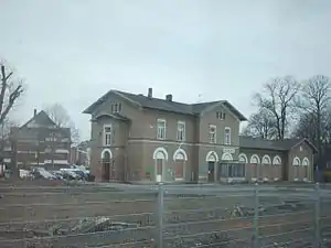 In 1967, the bridge had to be raised 60 centimetres and the track lowered to allow the installation of the overhead line for the electrification of the line. The old railway bridge was demolished in 1988 and replaced by a new reinforced concrete bridge. On 30 May 1980, passenger traffic on the line to Stolberg was discontinued and the tracks of the line to Jülich were dismantled. Freight transport to Ameln continued until 1 June 1984. Freight traffic was also abandoned in 1987. Today, the remaining two platform tracks to Rheydt and Cologne still have the track numbers of 9 and 10 although tracks 1–8 were removed with the dismantling of the line to Jülich. The closure of the Stolberg line meant that the placement of the still well-preserved entrance building is unusual today. This is about 40 metres from the island platform. The pedestrian subway to the island platform ends in an open field. Between the remaining rail tracks and the front of the reception building, there is now a parking lot. This was part of a project that involved the building of 41 apartments for the elderly and a community hall at the station and in new buildings.[6] The street to this small building area is called Falkensteinstrasse after a local Jewish family.[7]