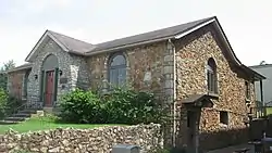 The building is a one-story stone-veneer building with some Colonial Revival stylings in its interior mantles and decorative door surrounds.[2]