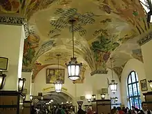 Munich's largest tourist attraction after the Oktoberfest, the Hofbräuhaus am Platzl is also frequented by locals, many of whom keep their personal mugs ("Krüge") stored there.[4] During regular hours traditional Bavarian music is played. The famous Hofbräuhaus song (Hofbräuhaus-Lied), composed in 1935 by Wilhelm "Wiga" Gabriel, goes: "In München steht ein Hofbräuhaus, eine, zwei, g'suffa!" ("There's a Hofbräuhaus in Munich—one, two, down the hatch!" in the local dialect).[5]