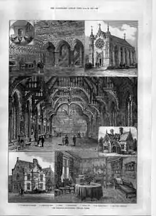 The first clerk of works was J. P. Featherstone who had been a tenant farmer under Holloway: he was appointed in April 1873 and resigned on 24 December 1876. Among the contractors were: Sharpington & Cole, London (masons); W. H. Lascelles, Finsbury (joiner); George Burfoot, Windsor (paving); Pontifex & Wood, London (lead); Wilson W. Phipson (heating); J. Gibson, Battersea (landscaping); J. D. Richards, London (furnishings). Ancillary works included the gas works at a cost of £1,950, six cottages and a workshop, and the sewage works which were constructed by John Thompson of Peterborough at a cost of £1,500.[5]
