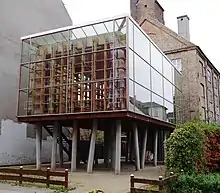 The building is extended with an assembly hall that is raised one storey above the ground on concrete pillars. The supporting structure in the hall is an exposed framework of plywood clad with glazing panels in pine frames.[2]