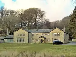 The land that sites Holme Hall dates back to 1340 when Richard de Whitacre arrived in Cliviger from High Whiteacre (Padiham). In 1431, The Holme, then a manor house of 40 rooms, was referenced in connection with Thomas Whitaker. The process of converting the original wooden structure into stone began in 1603 and was completed 1717 with west wing. The Whitakers installed windows in the stairway that had been removed from the old St Mary's Church, Blackburn after the church was demolished in 1819,[1] and built an extension to the rear in 1854. The family sold the house in 1950.[1] The land once belonged to the Tattersall family and housed a chapel which lent its name to the neighbouring village of Holme Chapel.