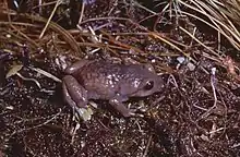 Although very little information about the reproduction of highland frogs is available, it is believed that they breed by direct development. They lay their eggs under mulch and leaves, and a parent will guard the eggs.[6] If threatened, the parent highland frog will raise itself on its forelimbs, and hiss at the potential predator to try to make it go away. The offspring, however, bypasses the larval stage and becomes a miniature adult when it hatches from its egg.[4]