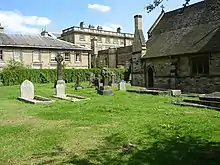 The east end of a stone church is seen through a graveyard from the north. On the right is a battlemented tower and the nave extends to the left