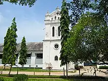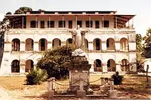Soon thereafter, the first church was built in 1872, after establishing the mission, as a simple towered structure of French design but with local materials. With its many arches and pinnacles, the tower resembles a mitre. This "squat tower" has since been renamed as Livingston tower. Father's residence (a triple storied building with wide balcony) was also built at the time in the local style with mangrove wood floor and roof, and coral stone walls of a precolonial style of architecture. It has open arches on its periphery and has no resemblance to the German colonial architecture. The Sisters' Convent was also built in the same style.[7][3] During this time cholera epidemic had also affected the town and people took refuge in the mission complex. The objective of the French Missionaries, who founded the mission here, was to free slaves from their bonded labour, which though initially had limited success but generated awareness to further the cause of an Awareness Movement of the east African Slave Trade.[3]