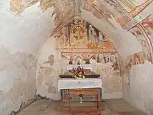 Its interior, constructed with regular stone blocks with stone pavement-slates, is decorated with fresco paintings by Albert from Constance. Together with usual scenes of the Christological cycle on the sanctuary side walls, Albert also painted the scene of the Throne of Mercy with the saints on the wall above the altar. The frescoes at the entrance of the church depict angels and hell.[1]