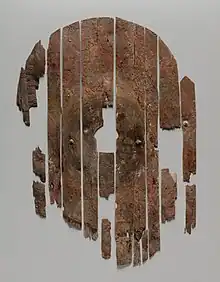 Although both the preliminary and final reports of the excavation describe the shields' material as poplar,[3][19] in 1935 Samuel Record, a Yale forestry professor, identified it as a local species of pine.[5] The shield is made of a number of thin vertical planks of wood, simply butt-joined side-to-side and adhered using an animal glue. The planks are varying in width (central planks are wider than outer planks) and thickness (as thick as 5-6 mm in center and shrinking to 2-3 mm on the outer edge), which suggest the original shield was convex, and flattened out due to being stacked with the other shields in the embankment. Anne Gunnison and Irma Passeri theorize in their investigation of the shields that steam was used to bend the wood over a mold to achieve this convexity.[20]