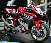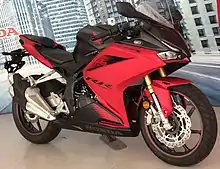 The Honda CBR250RR is a CBR series 250 cc (15 cu in) twin-cylinder sport bike made by Astra Honda Motor, a subsidiary of Honda in Indonesia.[8] It was unveiled in July 2016 in Jakarta.[9] Production was started in November of the same year for the 2017 model year.[10] It is the first CBR motorcycle to have a twin-cylinder engine on RR moniker. It is also the smallest Honda motorcycle to wear a CBR-RR badge. Previously, Honda also used the "CBR250RR" name for their four-cylinder sport bike sold between 1990 and 1996. The bike is officially sold in Indonesia, Japan, Hong Kong, Macau, Thailand, and Malaysia.[11][12]