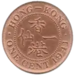 The one-cent coin was the smallest-denomination coin of the Hong Kong dollar since 1866 until its replacement in 1941 by the one-cent note. During World War II the loss of coins dated 1941 along with their subsequent melting during the Japanese occupation of Hong Kong has resulted in the survival of no more than 100 coins.