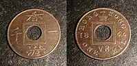 The one mil coin was the smallest denomination of the Hong Kong dollar from 1863 to 1866, after this date it was no longer issued but may have circulated much longer. Its value was one tenth of a cent, or a thousandth of a dollar. It was minted by the Royal Mint, it features the Royal cypher of "VR", of the reigning monarch Queen Victoria at the time, but didn't feature a profile of the face of the monarch as all other coins did, due to the hole in the middle.