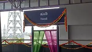 Hoodi (formerly known as Hoodi Junction) is an elevated metro station on the East-West corridor of the Purple Line of Namma Metro in Bengaluru, India which holds the main Hoodi neighbourhood area. Around this station, holds the SR Enterprises followed by some locations like Skylark Esta Apt Complex, MacPro Technologies and many more.[1][2][3]