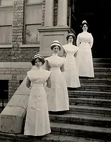 In 1912 the Religious Hospitallers of St. Joseph established a nursing school in Kingston at Hotel Dieu Hospital.[6] This became necessary as Sisters could no longer care for the increasing number of patients at the hospital. Training, which was initially provided by nursing Sisters and doctors at the hospital, ended with the graduate earning a three-year diploma. It became a two-year program in 1970[7] The first class graduated in 1914 and the final class was the Class of 1974. In total, 1695 nurses graduated from the school[8] The school was closed in 1973 as all hospital-based diploma nursing programs in Ontario were transferred to Colleges of Applied Arts and Technology. The Class of 1974 spent their first year at the Hotel Dieu and their second at St. Lawrence College.[9]