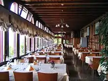 The restaurant is noted for its 47 metres (154 ft) long veranda at the front, overlooking the Sarneraatal and the Glaubenberg.[2][6] 4 of the 83 rooms are furnished with the furniture of the original hotel.[4]