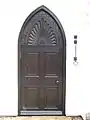 Houghton Lodge exemplifies this Cottage Ornée style; the principal reception rooms are placed on the ground floor, rather than on a piano nobile. The reception rooms, typical of the style, have french windows, shaded by a verandah, allowing immediate access to the garden. Many of Houghton's windows are in the exaggerated, decorative Gothic, almost Islamic, style which originated from the Walpole's Strawberry Hill Gothic.[6]