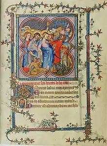 The Hours of Jeanne de Navarre is an illuminated book of hours with miniatures painted by Jean Le Noir. The book was commissioned by Philip VI of Valois and his wife, Blanche de Navarre, for Jeanne de Navarre, Queen of Navarre. The book was created sometime between 1336 and 1340 and is now in the Bibliothèque Nationale, Paris.[1]