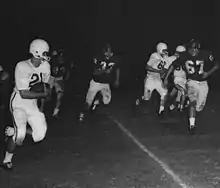 Hal Lahar was announced as Houston's next head coach on January 18, 1957.[17] Lahar came from Colgate University, where he had served as head coach for five seasons.[18] In college, Lahar had played for the Oklahoma Sooners, where he was a part of the school's first bowl team.[19] Under Lahar, during the 1958 season, the Cougars became a nationally recognized offensive leader, as the team scored a combined 117 points in their first three games. Lahar's offensive strategy was best characterized as Split-T.[20] After winning the Missouri Valley Conference titles again in 1957 and 1959, Lahar left UH in 1961 and headed back to Colgate University.[19]