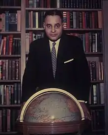 Ralph Bunche, an American political scientist and diplomat, received his MA in political science in 1928 and PhD in 1934 from Harvard University.[22] He was appointed an instructor in political science at Howard University, and rose to become professor and chair of the department. From 1936 to 1938, Bunche studied anthropology and conducted postdoctoral research at Northwestern University and the London School of Economics (LSE).[23] During this time, Bunche developed an expertise on the impact of colonialism on colonial subjects.[24] His book, A Worldview of Race, argues that race plays a role in modern economic, political, and social conditions.[25] When the US entered World War II, Bunche took a leave of absence from Howard University in 1941 and did not return to formal teaching. He worked as Senior Social Science Analyst for Africa in the Office of Strategic Services (OSS), then at the U.S. State Department, and finally, at the United Nations.[22] In this way, Ralph Bunche was both a practitioner of international relations and a scholar.[26] Turning theory to practice, he expanded the reach of the Howard School of International Relations academic thought by attempting to displace racial hierarchy in domestic and international institutions.[27][28]