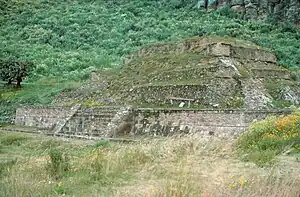 The site features a Teotihuacan influenced three-sided pyramid, 12 meters base by 8 meters high, with an altar that possibly was used for sacrificial offerings.[3]