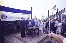 Scott supported New York Governor Nelson Rockefeller for the Republican nomination in the 1968 presidential election.[12] Scott was re-elected in 1970, defeating Democratic State Senator William Sesler by a margin of 51 to 45 percent. Scott served until January 3, 1977, and was elected Senate Minority Whip in January 1969.[13] On September 5, of that year, Scott was designated as acting minority leader to fill in for the ailing incumbent, Everett Dirksen, who died two days later.[24] On September 24, Scott was narrowly elected Senate Minority Leader over Tennessee Senator Howard Baker (Dirksen's son-in-law), serving until 1977.[25][26]
