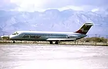 Hughes Airwest's planes were recognizable by their banana-yellow fuselage and tail colors.[30] Their airplanes were often dubbed "flying bananas" and the airline launched an advertising campaign with the catchphrase "Top Banana in the West."[3][4][5][31] Most nicknames given to Hughes Airwest airplanes in aviation books and magazines have to do with bananas. Apart from their all-yellow scheme, the airplanes also featured a blue logo on the vertical stabilizer (tail) that resembled three diamonds connected (possibly a reference to the initials of Howard Hughes). The name Hughes Airwest, in stylized lettering, was featured unconventionally below the front passenger windows.