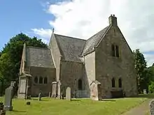 The church is surrounded by an ancient graveyard, still in use today, and described as resassuring a place to be buried as you could wish for...deep in the woods with the burn [river] besides.[5] Some of the still legible gravestones show dates from as early as the 17th century.