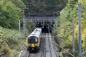 Hunsbury Hill Tunnel is a railway tunnel on the Northampton Loop Line of the West Coast Main Line. The tunnel runs in a straight line from the Briar Hill district of Northampton (north portal: 52°13′20″N 0°54′56″W / 52.2221869°N 0.915454°W / 52.2221869; -0.915454), England about north by east to the East Hunsbury district south of the town (south portal: 52°12′47″N 0°55′10″W / 52.213037°N 0.9193325°W / 52.213037; -0.9193325). The tunnel has a single bore with twin tracks and is 1,152 yards (1,053 m) long.[1] It is about 1 mile south of Northampton railway station and the next station south is Wolverton in Milton Keynes. The tunnel opened together with the rest of the loop line in 1881.[2]