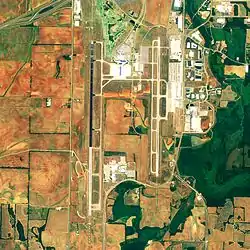 The airport covers 6,000 acres (2,428 ha) at an elevation of 629 feet (192 m). It has two asphalt runways: 18R/36L is 12,600 by 150 feet (3,840 x 46 m) and 18L/36R is 10,001 by 150 feet (3,048 x 46 m).[16] In the year ending December 31, 2019, the airport had 70,816 aircraft operations which averaged about 194 flights per day.