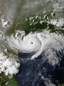 The storm's slow movement—averaging just 5 mph (8 km/h)—and lack of strong steering currents allowed Alicia to reap highly favorable conditions characterized by warm sea surface temperatures in excess of 84 °F (29 °C) and favorable winds in the upper troposphere due to an upper-level anticyclone, resulting in unabated intensification until landfall.[5][1] Radar analyses indicated that Alicia was stationary at times as it transitioned to a northwesterly heading.[5] An eye began to emerge on satellite imagery by the afternoon of August 16.[6] On August 17, Alicia strengthened into a hurricane with its pressure falling at a steady 1 mbar (hPa; 0.03 inHg) per hour.[1][4] At 06:00 UTC (1:00 a.m. CDT) on August 18, Alicia became a major hurricane and made landfall an hour later on Galveston Island25 mi (40 km) southwest of Galveston, Texas—with maximum sustained winds of 115 mph (185 km/h) and a minimum barometric pressure of 962 mbar (hPa; 28.41 inHg) as measured by aircraft reconnaissance,[4][5] making it a low-end Category 3 on the Saffir–Simpson hurricane wind scale.[4] Alicia was the first hurricane to strike the continental United States since Hurricane Allen moved ashore South Texas in August 1980, ending the longest break in contiguous U.S. hurricane landfalls of the 20th century.[1][7] The hurricane was also the first major hurricane to impact the Greater Houston area since Hurricane Carla in 1961.[8]