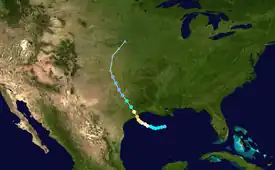 Alicia weakened as it accelerated northwest into the Texas interior, with the hurricane's center passing just west of Downtown Houston on the morning of August 18 as a Category 1 hurricane;[4] the storm was initially slow to weaken as it was able to rein in moist air from the warm Gulf of Mexico.[5] Later that day, the continued inhibitory impacts of friction and dry air weakened Alicia to a tropical storm near College Station, Texas,[9] and degenerated into a tropical depression early on August 19 near the Dallas–Fort Worth metroplex.[4] Despite having remained over land for 36 hours, Alicia remained well-organized while tracking into Oklahoma on August 20.[10] The tapering system transitioned into an extratropical cyclone later that day; these remnants persisted for another day before they were absorbed by a passing trough over eastern Nebraska on August 21.[1][4]