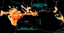 Map plotting the storm's track and intensity, according to the Saffir–Simpson scale