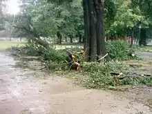 In Washington, D.C., the storm produced wind gusts of up to 45 mph (72 km/h) which, in combination with heavy rainfall, resulted in a few downed tree branches and power lines.[48] High tides left moderate damage in St. Mary's County, Maryland of about $4.4 million (2006 USD),[51] with the damage to trees and power lines considered worse than the impact in Hurricane Isabel in 2003. In neighboring Charles County, storm surge flooding forced the evacuations of houses along the waterfront.[48] The interaction between Ernesto and a high pressure area over eastern Canada produced high winds, heavy rainfall, tidal flooding, and high waves across the Mid-Atlantic and New England. In Delaware, the winds left 151,000 people without power, and the adverse conditions canceled several Labor Day Weekend events. A buoy in the Delaware Bay recorded a record-high wave height of 22.3 ft (6.8 m).[48] In southern New Jersey, 80 mph (130 km/h) winds left over 200,000 buildings without power, while high waves flooded or closed several roads and bridges.[48] Further north, between 2–4 inches (51–102 millimetres) of rain fell across Pennsylvania and New York.[52] In Pennsylvania, there were two deaths. A seven-year-old boy died at a hospital, after a tree limb fell on him. A man was trying to rescue his golden retriever from a drainage steam, while he was sucked into an outflow pipe, and was found dead after being pulled out of a manhole.[53] The rain in New York caused delays in the play at the 2006 US Open, and washed out a whole day's play.[52]