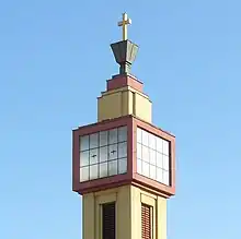 The design of the tower was a collaboration with Pavel Janák who designed the other nearby Hussite church in Vinohrady.[4] It is topped at 33 metres (108 ft) by a chalice which is a key symbol of the Hussite church as well as a cross.[3] There is an extended floor near the top of the tower which is surrounded by the four large glass panels. The design for the tower has four tall thin shuttered windows. The tower was intended to be seen as a "ship's lantern" which symbolises a "lighthouse" pointing the way to eternity.[5]