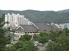 The Hwangseong Park is a park located in the neighborhood of Hwangseong-dong, Gyeongju, North Gyeongsang province, South Korea. Many of public sport facilities are located in the park with an area of 1,022,350 m2 including a luxuriant pine trees forest.[1][2] The site is originally where Doksan was situated, an artificial forest established in regards to feng shui during the Silla period. The Doksan forest was used as a training place for hwarang warriors, and a recreation venue as well as a hunting place for the Silla Kings, especially the 26th ruler, King Jinpyeong's favorite place.[3][4] Since 1975, Hwangseong Park has been designated as "city neighborhood park" and currently consists of multi-purposed Gyeongju Public Stadium, Football Park with 7 football fields and one futsal field, and one gymnasium, as well as Horimjang field for gukgung or Korean traditional archery and a ssireum wrestling ring.[5] In addition, it contains a gateball field, an inline skating rink, jogging courses, and cycling roads.[6] Among them, the construction of Gyeongju Public Stadium was completed in 1982.[7][8] and can accommodate 20,000 audience.[1]