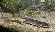 This species is also bred and sold as aquatic pets, often under name African dwarf frog that also includes other Hymenochirus species.[5] As pets, African dwarf frogs can live peacefully among other fish in an aquarium. Their tank mates should be neither large enough to pose a predatory threat to the frogs, nor small enough to become food for the frogs themselves. They are not an especially demanding species, and can be kept in most standard aquarium setups. Seeing as how they must breathe air to survive and can escape from the tank, aquariums that are not too tall and are well-covered are a must. They can be fed a diet of suitably-sized food items designed for use with aquarium fish, including live, frozen and freeze-dried bloodworms, tubifex worms, and brine shrimp. These frogs are not picky but overfeeding will quickly lead to obesity. They will also eat any form of prepared food that sinks to the bottom.[5][6]