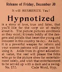 The single reel drama, approximately 1,000 feet long, was released on December 30, 1910.[1] The film was released in Britain under the title A Quack Hypnotist on April 26, 1913.[10] The film likely had a wide national release, known advertising theaters include those in Arizona,[11] Pennsylvania,[12] and Kansas.[13] Some theaters did not provide the production credits,[14] complicating identification with Selig Polyscope's Hypnotized.[15] The film received a positive review in the Moving Picture World which said, "It is a good story, well told, and the audience seems intensely interested in it."[1] The New York Dramatic Mirror offered a review that neither commended or criticized the production in its summary review of the film.[1]