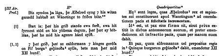 Opening clauses of the Wantage Code printed in the edition of Felix Liebermann, with the Old English of Textus Roffensis and the Latin of Quadripartitus side by side.
