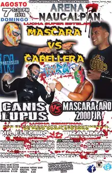 The IWRG Máscara vs. Cabellera (August 2016) show (Spanish for "mask versus hair") was a professional wrestling supercard event produced by Mexican professional wrestling promotion International Wrestling Revolution Group (IWRG), and took place on August 7, 2016 in Arena Naucalpan, Naucalpan, State of Mexico, Mexico. The focal point of the Máscara vs. Caballera series of shows is one or more traditional Lucha de Apuestas, or "Bet matches", where all competitors in the match risk their hair on the outcome of the match. The Lucha de Apuestas is considered the most prestigious match type in lucha libre, especially when a wrestlers mask is on the line, but the "hair vs. hair" stipulation is held in almost as high regard.
