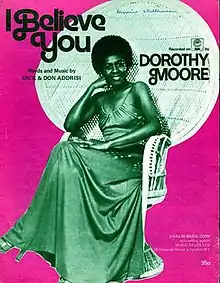 "I Believe You" is a love ballad composed by Don and Dick Addrisi which was a 1977 single for Dorothy Moore; taken from her self-titled Dorothy Moore album. "I Believe You" reached #5 R&B and crossed over to the US Pop Top 30 at number 27.[1] The track also reached number 20 in the UK.[2]