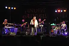 The classic line-up of I Nuovi Angeli peaked in the early 1970s, thanks to a string of top-ten hits written by Renato Pareti and Roberto Vecchioni,[2][1] including Donna Felicità (1971), Uakadi Uakadù (1971), Singapore (1972) and Anna da dimenticare (1973).[3] In 1971 I Nuovi Angeli embarked on a North-American tour and made their first TV appearance in America on the Ed Sullivan Show.[4] In 1974 I Nuovi Angeli recorded Stasera Clown, a concept album in collaboration with the La Scala Orchestra revolving around the live of a group of circus artists.